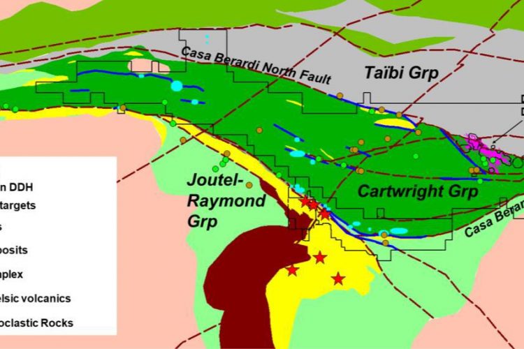 Die Liegenschaft Douay-Joutel erstreckt sich über verschiedene geologische Horizonte, die mit VMS-Mineralisierung in Verbindung stehen. Zielgebiete umfassen EM-Anomalien in der Nähe historischer Lagerstätten. Die geplante Weiterentwicklung umfasst Datenkompilation, Feldarbeiten und lithogeochemische Untersuchungen, um die vielversprechendsten VMS-Zielgebiete für Bohrungen vorzubereiten. Ähnliche Arbeiten sind für das Gebiet Morris geplant.
