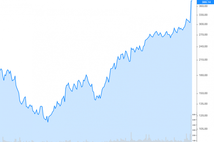 Die Aktie des US-amerikanischen Halbleiterherstellers Nvidia ist nach Bekanntgabe der neuesten Geschäftsergebnisse um über 26% auf zeitweise fast 395 US-Dollar gestiegen, deutlich über das vorhergesagte Ziel von 330 US-Dollar hinaus. Dies markiert ein neues Allzeithoch und übertrifft das alte Hoch von ca. 346 US-Dollar.